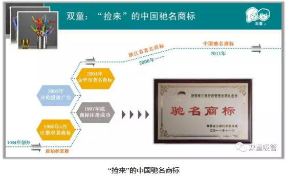 于是,樓仲平就拿著這個圖案去找義烏工商局咨詢,義烏工商局的科長直接了當(dāng)?shù)馗嬖V他,這一定是已經(jīng)注冊過的商標(biāo)了!但樓仲平并不死心,花了三百塊錢查詢費要求科長在電腦上查一下,經(jīng)過查證之后發(fā)現(xiàn)這個商標(biāo)還真沒有人注冊,于是,樓仲平立馬帶著相關(guān)證件,用了2000元搶占先機,把這個圖案注冊為商標(biāo)。在確定商標(biāo)名稱時,根據(jù)圖案上兩個兒童的標(biāo)志,樓仲平夫婦將“雙童”確定為商標(biāo)的名字。正是樓仲平的這次舉措,“撿來”了“雙童”的中國馳名商標(biāo),也邁出了企業(yè)的品牌建設(shè)發(fā)展最為關(guān)鍵的一步,改變企業(yè)命運的同時也提升了整個行業(yè)的認(rèn)知!