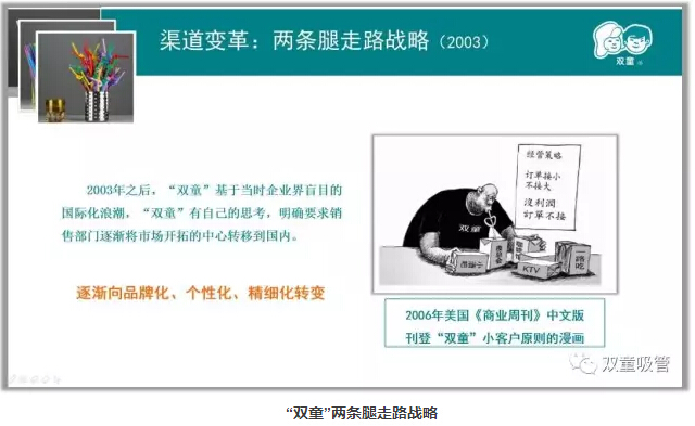 同時,“雙童”也利用互聯(lián)網(wǎng)的優(yōu)勢,先后投入數(shù)千萬資金用于“雙童”品牌的塑造和國內(nèi)市場的渠道建設(shè),持續(xù)尋找如酒店、夜總會、KTV、咖啡廳等中高端消費場所的小訂單,爭取到了大量原被傳統(tǒng)制造企業(yè)忽視的小客戶群體,開始實施“小客戶原則”的經(jīng)營戰(zhàn)略。