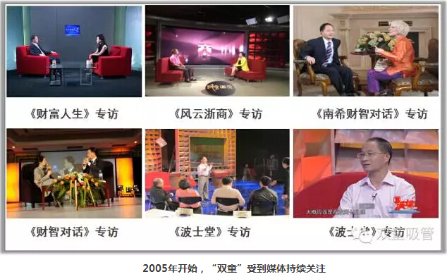2006年開始,中央電視臺《新聞聯(lián)播》、《焦點訪談》、《財經(jīng)頻道》、《波士堂》等十幾家國內(nèi)權(quán)威媒體也關(guān)注到“雙童”,大量報道“雙童”節(jié)能降耗、員工關(guān)懷等經(jīng)營理念。媒體的大量報道引發(fā)了社會各界對“雙童”的關(guān)注,一時間全國各地政府企業(yè)組團來“雙童”參觀,光光2007年,“雙童”就接待了共3500位參觀者,在無形當(dāng)中為“雙童”品牌傳播創(chuàng)造了很好的傳播手段!