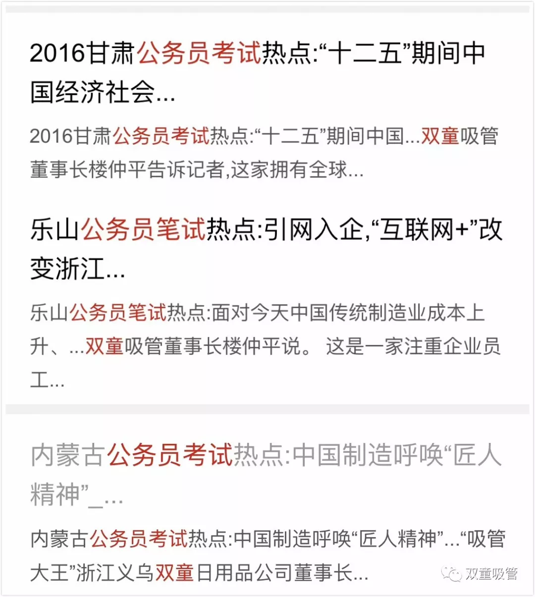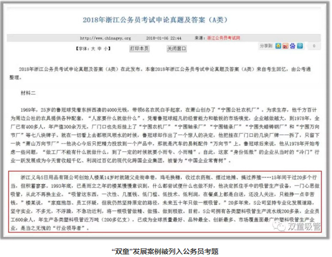 小微企業(yè)是浙江經(jīng)濟(jì)特色和優(yōu)勢所在,所以在2018年浙江省公務(wù)員考試的申論材料中,特地提到了義烏S公司堅(jiān)守吸管實(shí)業(yè),推動(dòng)了中國工業(yè)的轉(zhuǎn)型升級(jí),成為了浙江企業(yè)的標(biāo)桿!“雙童”也再次被列入公務(wù)員考題。