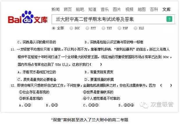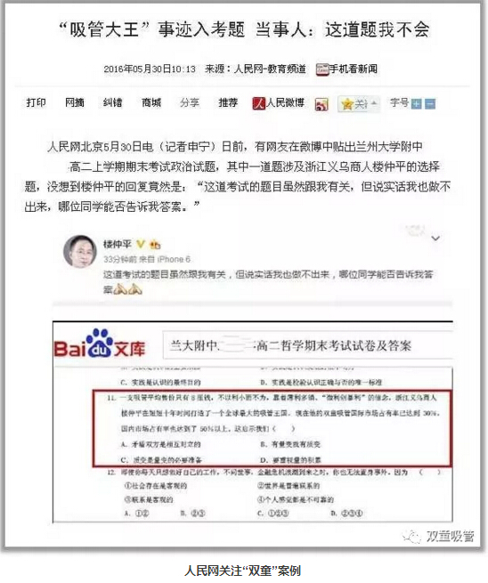 “雙童”案例也因此經(jīng)常被學(xué)校試題所采用。在蘭大附中高二期末考試的試題中,以“雙童吸管”為案例的考題還難住了樓仲平呢!案例當(dāng)事人居然不會(huì)做?這一有趣的現(xiàn)象也引起了人民網(wǎng)的報(bào)道!
