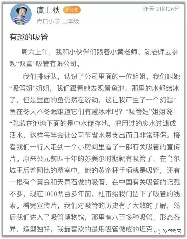 今天,我走進(jìn)了“雙童”,了解了關(guān)于吸管的許多知識。我們身邊一根不起眼的吸管卻包含了我們好幾代人的智慧。從前的秸稈吸管,后來的紙質(zhì)吸管,再到現(xiàn)在的塑料吸管。吸管一直在進(jìn)步,希望未來它能更加出色。