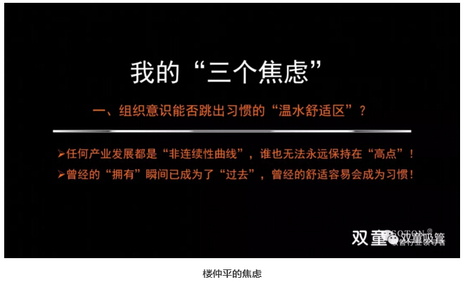 樓仲平分享了自己的第三個(gè)焦慮:2011年,“雙童”明確“再造經(jīng)理人”計(jì)劃,選拔培養(yǎng)年輕領(lǐng)導(dǎo)層,管理團(tuán)隊(duì)更加年輕化,“雙童”管理團(tuán)隊(duì)也更加年輕、有斗志,有激情。但當(dāng)我看到這批年輕的管理團(tuán)隊(duì)臉上洋溢著對(duì)未來(lái)的期待、渴求和夢(mèng)想的時(shí)候,我明白他們現(xiàn)在正“嗷嗷待哺”,我需要給他們創(chuàng)造更大的空間和更廣闊的平臺(tái),我產(chǎn)生了無(wú)限的壓力和焦慮。我要思考如何創(chuàng)造空間,讓他們實(shí)現(xiàn)更大的夢(mèng)想,我不能讓我的邊界限制企業(yè)的未來(lái)十年,不能讓我的邊界限制年輕有為的管理團(tuán)隊(duì)!