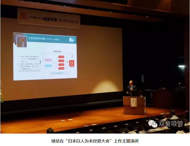 隨后,會議正式進入分享環(huán)節(jié)。“雙童”樓仲平圍繞著“人本經(jīng)營”在“雙童”的形成索源、實踐、持續(xù)改善方面進行分享。雖然語言翻譯需要借助翻譯的轉達,但大家依舊沒有受到影響,日本人的認真態(tài)度實在是值得我們國人學習!