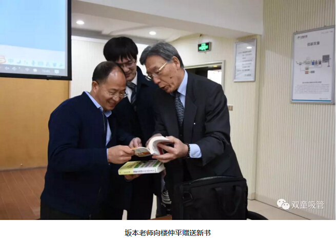 參觀完畢,大家來到九樓閣交流分享。首先,坂本老師向樓仲平贈送了他新出的兩本管理書籍,并代表日本團隊由衷地對“雙童”的熱情貼心接待表達了感謝之情!