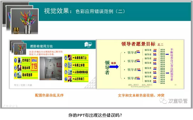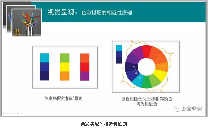 想要制作一個美觀的PPT,色彩的搭配也尤其重要!樓仲平也分享了色彩搭配的相近原則、色彩點綴的相對原則等技巧,下面就通過圖片來看看色彩的搭配和一些錯誤的案例吧!