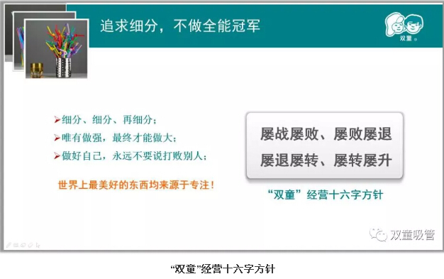 屢戰(zhàn)屢敗、屢敗屢退、屢退屢轉(zhuǎn)、屢轉(zhuǎn)屢升。實(shí)際上,“雙童”的這十六字經(jīng)營戰(zhàn)略方針中所蘊(yùn)含的哲學(xué),就是不斷創(chuàng)新,永不止步!企業(yè)沒有所謂的成功,只有不斷地成長!不管是經(jīng)營什么企業(yè)、制造什么產(chǎn)品,都應(yīng)該打破傳統(tǒng)的思維模式,在不斷地探索中找到自己的發(fā)展道路!親,你明白了嗎?
