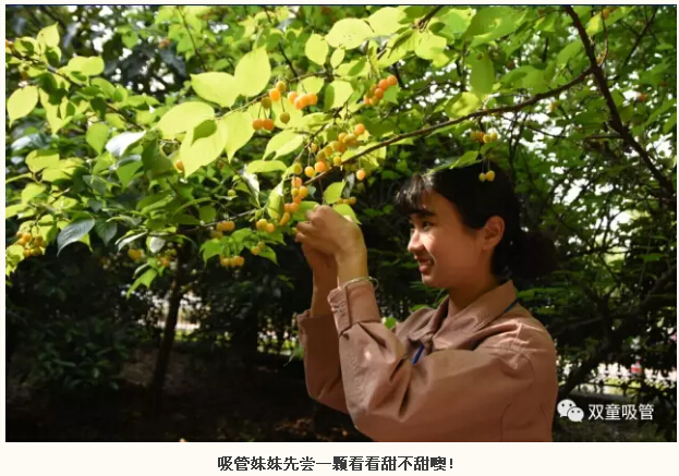 如此誘人的櫻桃,吃貨們當(dāng)然待不住啦!吸管妞和吸管妹妹們作為“雙童”專業(yè)吃貨當(dāng)然要先去幫大家嘗嘗味道啦!從樹上摘下櫻桃,直接丟進(jìn)嘴里,真是甜到了心坎里,忍不住吃了一顆又一顆,還有哪種新鮮比得上這樣現(xiàn)采品嘗呢!