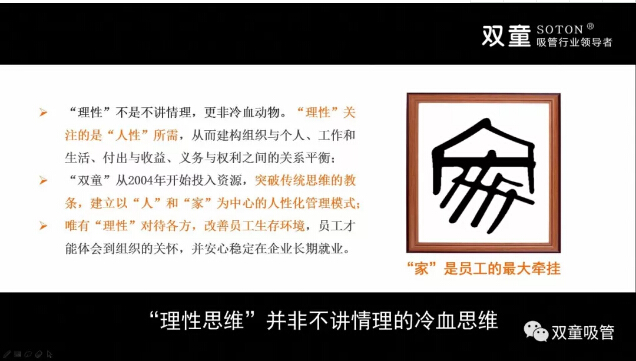 需要注意的是,所謂的“理性經(jīng)營”絕非是不講情理,更非冷血?jiǎng)游铩袄硇浴标P(guān)注的是“人性”所需,“雙童”建立以“人”和“家”為中心的人性化管理模式,“理性”地“善待員工”,實(shí)質(zhì)是引導(dǎo)員工“善待企業(yè)”。