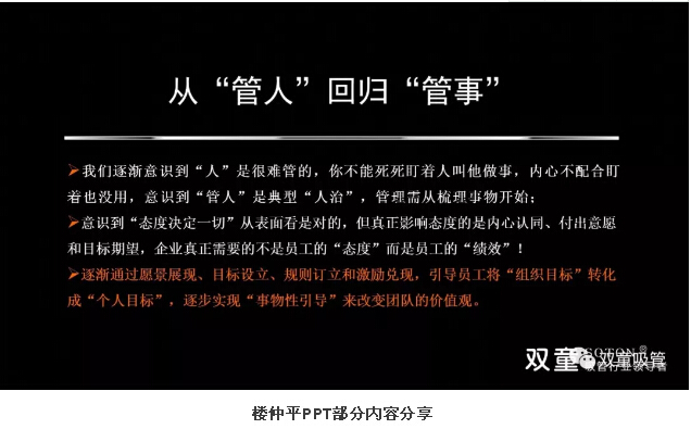 在“理性”思維的持續(xù)引導(dǎo)下,“雙童”在文化中倡導(dǎo)把員工看成是平等、完整的“人”,而非站在道德高地上居高臨下。在“雙童”的文化呈現(xiàn)、氛圍營造和溝通方式上,處處體現(xiàn)了“理性”思維,通過愿景展現(xiàn)、目標(biāo)設(shè)立、規(guī)則訂立和激勵(lì)兌現(xiàn),引導(dǎo)員工將“組織目標(biāo)”轉(zhuǎn)化成“個(gè)人目標(biāo)”,逐步實(shí)現(xiàn)“事物性引導(dǎo)”來改變團(tuán)隊(duì)的價(jià)值觀。所以,管理不是管控、教條和賦予,而是激發(fā)和釋放每個(gè)人的善意,幫助員工成長、激發(fā)其創(chuàng)造,在共同追求中形成一致的價(jià)值和理念認(rèn)同。