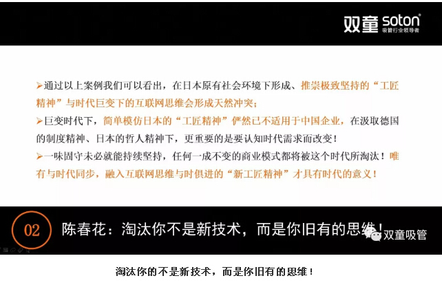樓仲平也引導(dǎo)現(xiàn)場(chǎng)創(chuàng)業(yè)者們:日本原有社會(huì)環(huán)境下形成、推崇極致堅(jiān)持的‘工匠精神’與時(shí)代巨變下的互聯(lián)網(wǎng)思維形成了天然沖突!巨變時(shí)代下,簡(jiǎn)單模仿日本的‘工匠精神’儼然已不適用于中國(guó)企業(yè),在汲取德國(guó)的制度精神、日本的哲人精神下,更重要的是要認(rèn)知時(shí)代需求而改變!‘工匠精神’也需要與時(shí)俱進(jìn),唯有與時(shí)代同步,融入互聯(lián)網(wǎng)思維與時(shí)俱進(jìn)的“新工匠精神”才具有時(shí)代的意義!