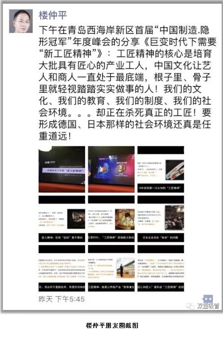 頒獎(jiǎng)盛會(huì)后,“雙童”樓仲平在“中國(guó)制造·隱形冠軍”年度峰會(huì)上做了《巨變時(shí)代下需要“新工匠精神”》的主題分享。