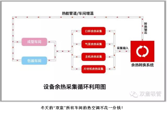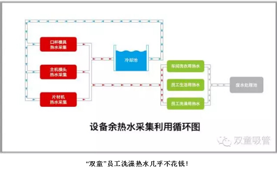 設(shè)備余熱水采集和設(shè)備余熱采集循環(huán)系統(tǒng):“雙童”對所有經(jīng)過模具的50度溫水進(jìn)行收集,處理之后供應(yīng)到所有寢室衛(wèi)生間給員工洗澡洗衣生活之用。同時(shí),“雙童”也引進(jìn)日本技術(shù)對所有生產(chǎn)設(shè)備的余熱和廢氣進(jìn)行采集并回收,再通過空調(diào)管道輸送到需要加溫的各個(gè)車間和工段。通過上述方式,“雙童”光是在余熱水采集和設(shè)備余熱采集方面,每年就節(jié)省了150多萬元,消滅了企業(yè)產(chǎn)生的污染和排放!