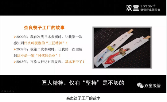 2000年9月,在這位友人的帶領(lǐng)下,我第一次參觀了一家位于奈良的一次性筷子工廠。這是一家有著45年歷史的老廠,一兩千平方米的老廠房車間內(nèi),機(jī)器舊得發(fā)亮,但生產(chǎn)的產(chǎn)品卻極為精致,精湛的工藝水平,讓彼時(shí)的國(guó)內(nèi)企業(yè)很難超越。受此影響后,“雙童”2002、2003年便開始逐漸放棄“多元”理念,專注吸管生產(chǎn),慢慢求得質(zhì)量上的提升。并將這種“專注”滲入到員工教育中,志存高遠(yuǎn)、長(zhǎng)遠(yuǎn)積累。