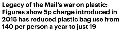 “根據(jù)數(shù)據(jù)顯示,自2015年推出對每個塑料袋征收5便士(約4.5毛)稅款法案后,英國的塑料袋使用量從人均每年140個降至19個!”