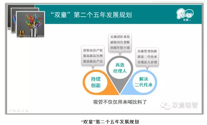 現(xiàn)在,公司有二三十個(gè)中高層,平均工齡10年以上,年齡30歲左右,都是我一個(gè)個(gè)帶出來的,“雙童”做的吸管是一個(gè)比較偏門的行業(yè),沒有行業(yè)的通用性人才,所以我們基本不用空降兵。這批人是我?guī)С鰜淼?,就深受我的影響,在乎工作、可以放下身段,整體素質(zhì)遠(yuǎn)超第一代管理者。這批第二代管理者培養(yǎng)起來后,至少打開了“雙童”未來二十多年企業(yè)持續(xù)發(fā)展的窗口。