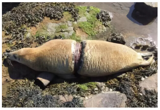 一只被塑料打包環(huán)死死套住的海豹,