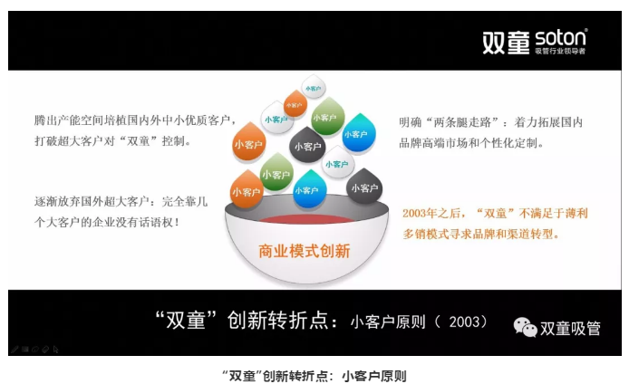 所以,這個(gè)時(shí)候我們逐漸放棄國(guó)外一些大客戶,開(kāi)始實(shí)施小客戶原則,到現(xiàn)在積累了16000多家中小客戶,從而讓“雙童”不會(huì)受客戶所限。