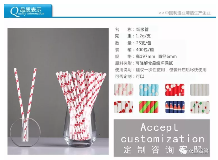 相對(duì)于塑料吸管,紙質(zhì)吸管以食品接觸類原紙為主要材料,并能用大豆基油墨印刷各類花色,在顏色鮮艷飽滿的同時(shí),確保安全無毒無異味,在回收廢棄后三到四個(gè)月內(nèi)可完全降解,符合歐美國(guó)家對(duì)食品安全包裝的衛(wèi)生要求,可用于生日派對(duì)、餐飲連鎖、家庭消費(fèi)、兒童DIY用具等各類場(chǎng)所!