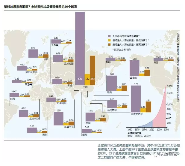 通過外河排入海洋的塑料垃圾數(shù)量為何如此驚人?最大的原因在于對塑料垃圾管理的失??! 據(jù)《海洋地圖集2017》顯示,全球塑料垃圾管理最差的20個國家中,中國處理不當?shù)乃芰侠鴶?shù)量大約為882百萬立方米/每年!