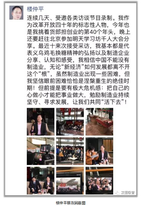 節(jié)目錄制結(jié)束之后,樓仲平也在朋友圈感言:連續(xù)幾天、受邀“改革開放40周年”訪談節(jié)目,我基本都是代表義烏雞毛換糖精神的弘揚以及制造企業(yè)分享、認(rèn)知和感受,我相信中國不能沒有制造業(yè),無論“新經(jīng)濟(jì)”如何發(fā)展都離不開這個“根”,雖然制造業(yè)出現(xiàn)一些困難,但我堅信眼前困難恰恰是涅槃重生的絕佳時期!但前提是要有極大危機感:把自己的心做小才能把事業(yè)做大,勉勵制造業(yè)持續(xù)堅守、尋求發(fā)展,讓我們共同“活下去”!