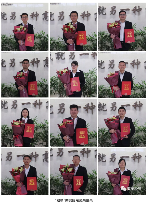 12月19日,雙童吸管第一期股權(quán)激勵啟動大會隆重舉行,“雙童”12位新晉股東脫穎而出!他們大多都是從基層做起,完成了從打工仔到新晉股東的勵志蛻變!
