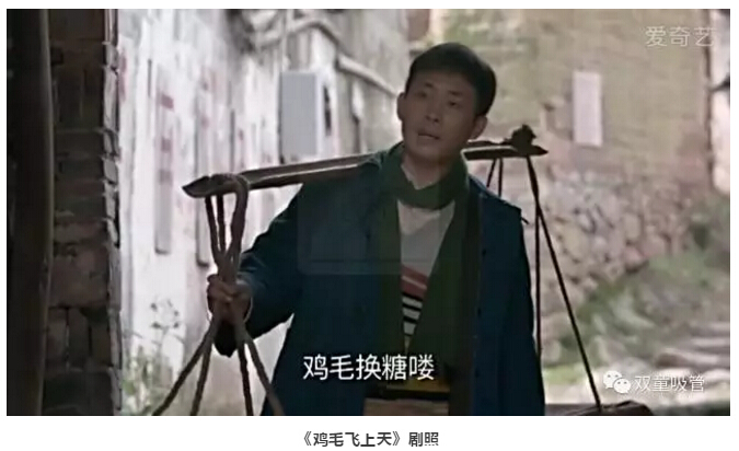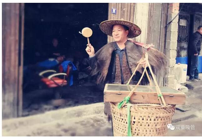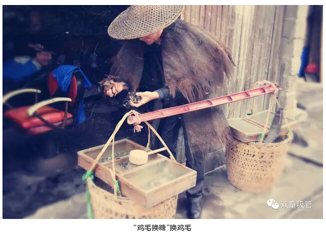 這是“雞毛換糖”人挑貨郎擔(dān)的場景……