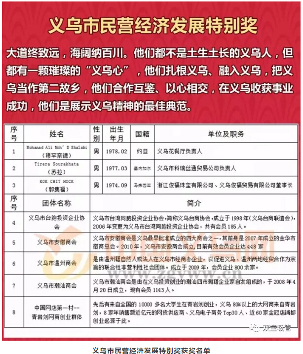 同時,此次大會還對以下的義烏市民營經(jīng)濟發(fā)展代表人士進行了頒獎表彰!