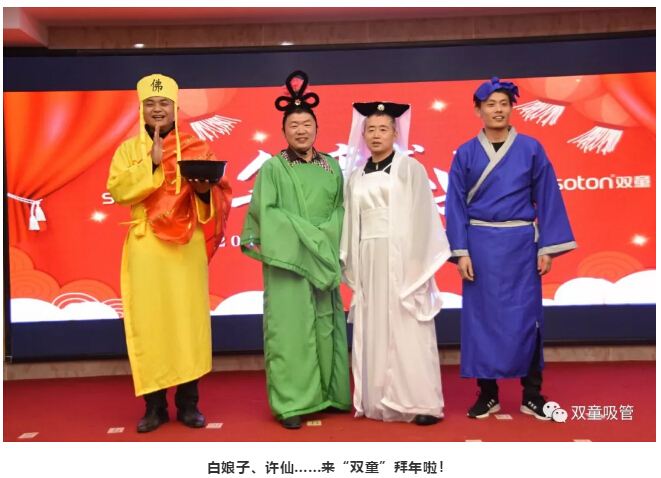 “雙童”年會(huì)的高潮節(jié)目來了!負(fù)責(zé)生產(chǎn)的副總經(jīng)理李秀前攜三大車間主任化身《白蛇傳》經(jīng)典人物前來拜年了,白娘子撒嬌、小青選白蛇王子、合唱《千年等一回》…… 逗得現(xiàn)場(chǎng)觀眾們捧腹大笑!