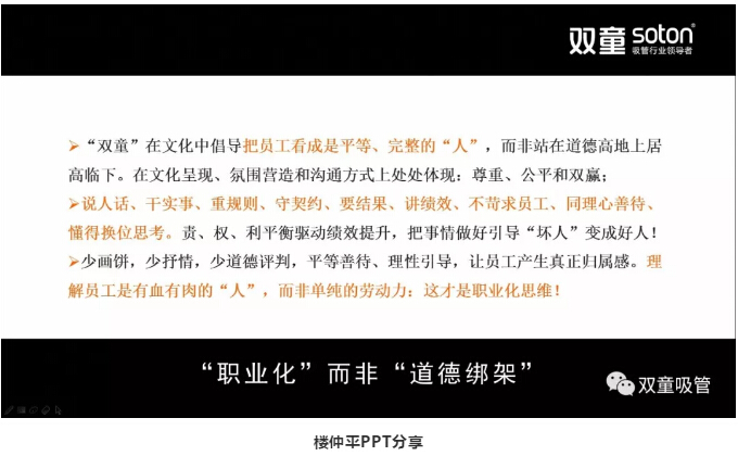 在看完樓仲平的視頻之后,可能很多人會心存疑慮:“雙童”明明是倡導(dǎo)"家文化"的企業(yè),竭盡所能對員工好,為什么不能讓員工在企業(yè)里談人情、感恩和奉獻呢,這難道不矛盾嗎?