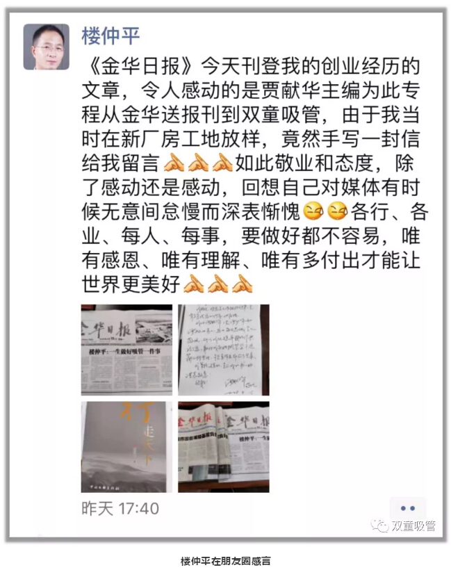 近日,《金華日報》刊登了一篇《樓仲平:一生做好一件事》的文章,專題報道樓仲平的創(chuàng)業(yè)經(jīng)歷。值得一提的是,在文章刊登后,《金華日報》賈獻(xiàn)華主編專程從金華送報刊到雙童吸管,其敬業(yè)的態(tài)度讓人欽佩!快來看看采訪正文吧!