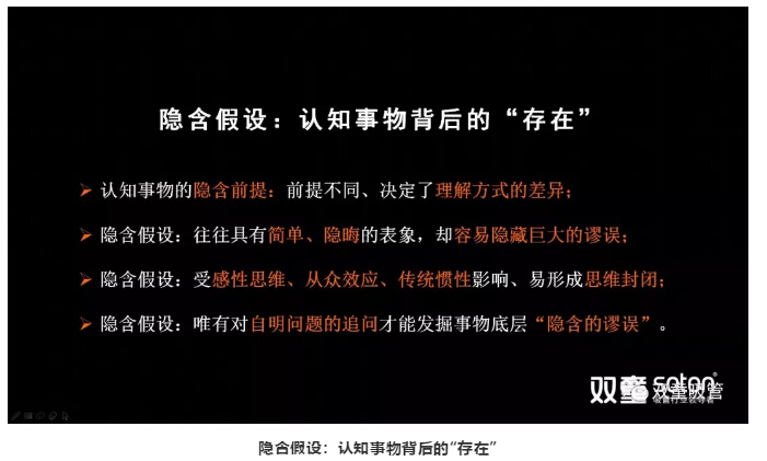 首先,樓仲平引導(dǎo)大家認(rèn)知事物背后存在的“隱含假設(shè)”,假設(shè)是通過想象可能存在的假說,隱含假設(shè)是認(rèn)知事物的基礎(chǔ)前提,容易受感性思維和傳統(tǒng)慣性影響,形成思維封閉。