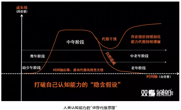 在該模型中,我們能夠看到人類的認(rèn)知從幼少年階段開始,到達(dá)中年階段的巔峰期。但隨著年齡的不斷增長(zhǎng),人類的認(rèn)知能力開始自然遞減,最終接近幼少年時(shí)期的認(rèn)知能力。在這個(gè)過程中,如果想要改變這一自然的“墮變規(guī)律”,就必然需要通過“代償干預(yù)”,對(duì)自身進(jìn)行不斷地調(diào)整和干預(yù),從而讓認(rèn)知能力從“下墮”走向“上揚(yáng)”,讓能力代償持續(xù)增量!