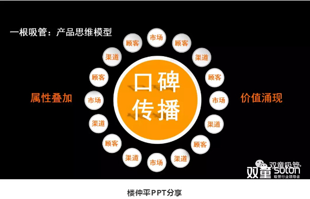 接著,樓仲平引導大家思考“產(chǎn)品 VS 商品”的關系,在這個模型中,產(chǎn)品本身(一根吸管)只是組成“商品”的基礎核心,是最基本的要素疊加之和,1+1=2。
