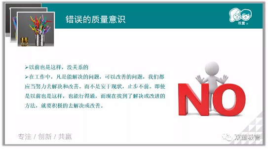 最重要的,就是樹立正確的質(zhì)量意識。在工作中,凡是能解決的問題,可以改善的問題,我們都應(yīng)當(dāng)努力去解決和改善,而不是安于現(xiàn)狀,止步不前。即使是以前也這樣能行得通,但現(xiàn)在找到了解決或改進(jìn)的方法,就要積極的去解決或改善。