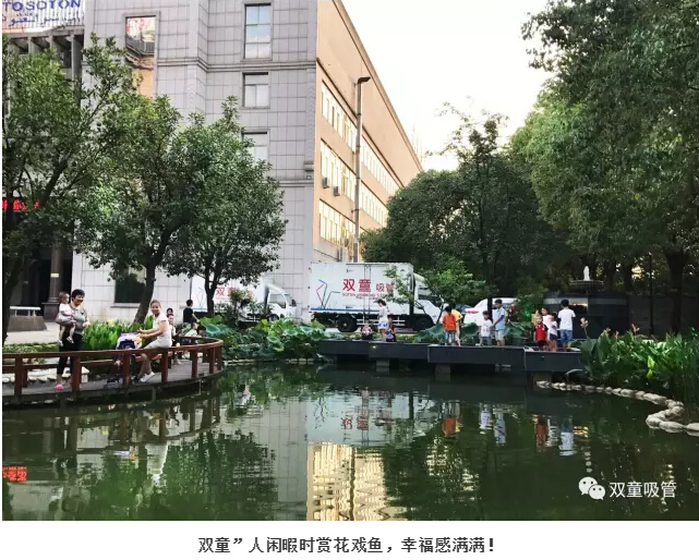 傍晚,總能看到三五成群的員工們,在橋邊散步,觀賞荷池美景,聽聽疊水瀑布的水流聲,看看斜陽在水中的倒影,感受魚兒在水里嬉戲的歡樂。這樣的散步閑聊時光,讓人感覺到幸福感滿滿!