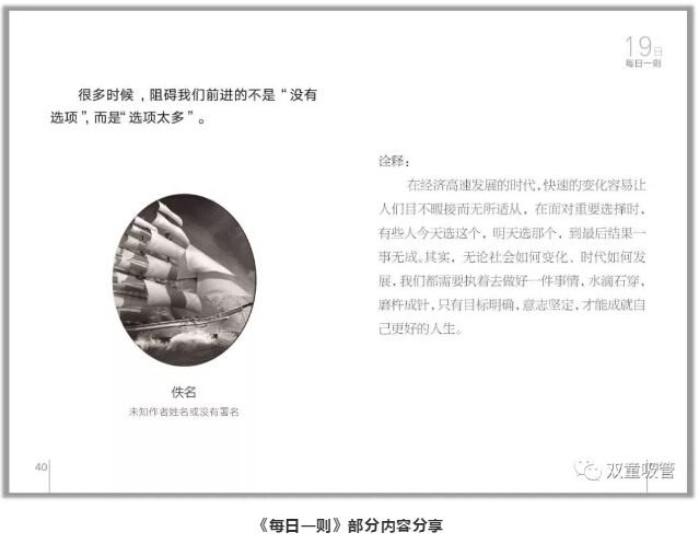 這本《每日一則》里,共收錄了31句名人經(jīng)典語錄,以月度為單位讓員工進行重復(fù)誦讀,內(nèi)容包含了專注、創(chuàng)新、共贏、正氣等主題。這可是員工們從幾千條好句里挑出來,并且自己解析的呢!