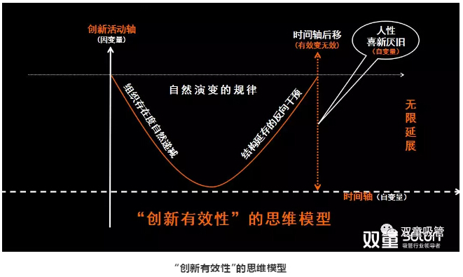在此過程中,“新”和“舊”在不斷的交替迭代。所以,創(chuàng)新就存在著“時間軸”,隨著“時間軸”不斷后移,原有的“創(chuàng)新”開始失效,最后變成了無效,創(chuàng)新活動也就“無窮無盡”!