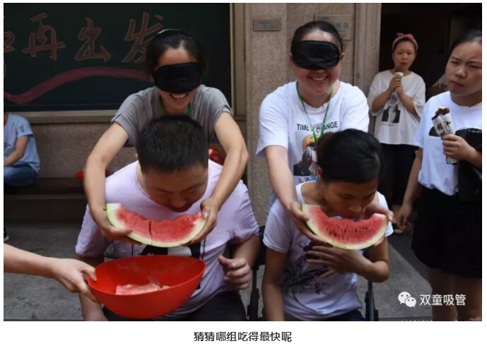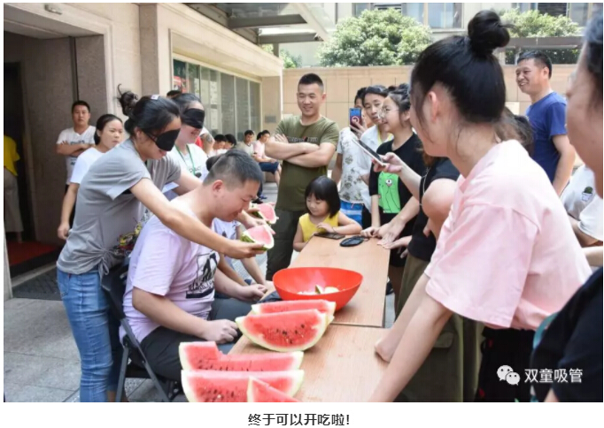 游戲的第一項就是“蒙眼吃西瓜”!聽到吃,大家的眼睛都亮了,笑說:吃西瓜,太簡單了!真的像大家說的很簡單嗎?快跟著妞來看看吧!