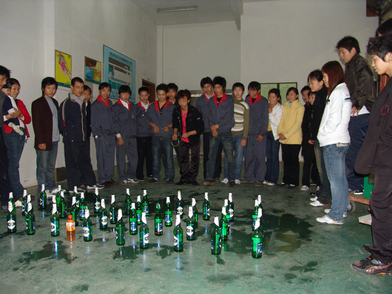 還有倒水和套圈圈比賽:倒水比賽為按照規(guī)定高度在啤酒瓶內(nèi)倒水,倒?jié)M啤酒瓶用時最少者勝出,套圈圈比賽為每人10個圈,套中數(shù)量最多者勝出。