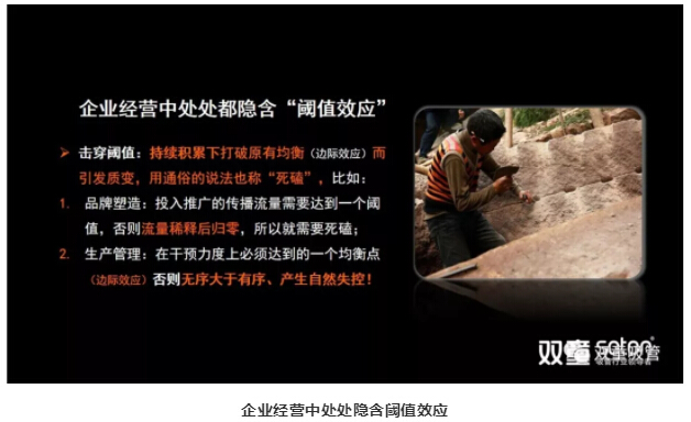 首先,引導大家理解企業(yè)經(jīng)營當中處處都隱含著閾值效應,而閾值擊穿,就是持續(xù)積累下打破原有均衡(邊際效應)而引發(fā)質(zhì)變,用通俗的說法也稱“死磕”。