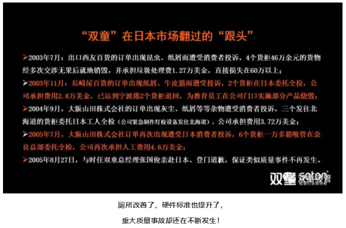 但廁所改善了,生產(chǎn)環(huán)境優(yōu)化了,硬件標準也提升了,重大質(zhì)量事故卻還在不斷發(fā)生!前前后后七八年的時間里,“雙童”在日本市場栽了不少“跟頭”,虧損了大量資金,在這樣的情況下,選擇“死磕”還是“放棄”?