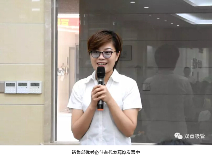 在表彰儀式后,來自銷售部及生產部的兩位優(yōu)秀奮斗者代表葛燁與胡醫(yī)發(fā)進行了發(fā)言,他們紛紛表示:很高興能夠遇見“雙童”,遇見“雙童”的改革,這一次所獲得的獎勵,不僅僅是榮譽上,更是公司對我們工作的認同與肯定,在接下去的工作中,也將再接再厲,努力做到更好,也希望下一次能夠再次走上這個舞臺。