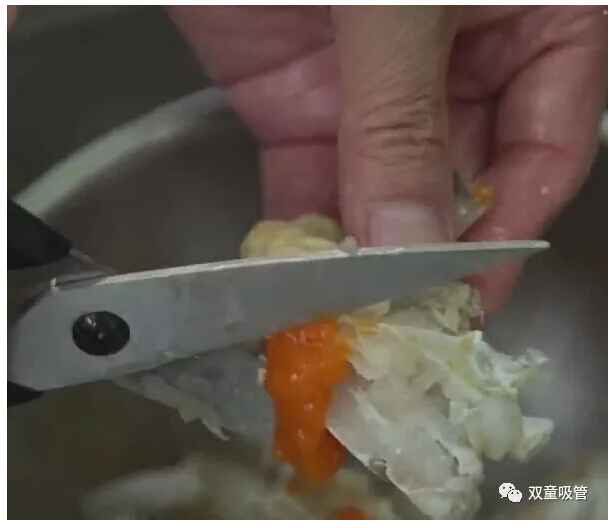 先用剪刀將梭子蟹剪成塊,待鍋中油燒熱后,放入配料和蟹一起翻炒。