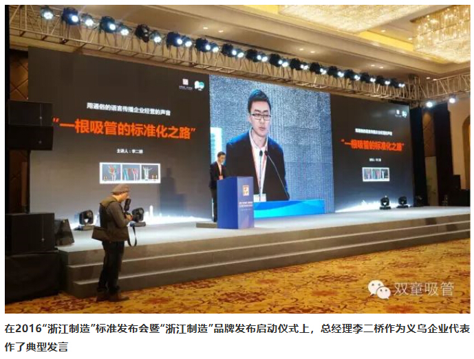 雙童成為義烏首家“浙江制造”標(biāo)準(zhǔn)企業(yè) 首先,讓我們來回顧一下“雙童”成為義烏首家制訂“浙江制造”標(biāo)準(zhǔn)企業(yè)的過程: 2016年年初,經(jīng)浙江省質(zhì)量技術(shù)監(jiān)督局、浙江省標(biāo)準(zhǔn)化研究院等相關(guān)領(lǐng)導(dǎo)專家團(tuán)隊(duì)多次論證,認(rèn)為“聚丙烯飲用吸管”符合“浙江制造”定位要求,推動(dòng)聚丙烯飲用吸管品牌認(rèn)證具有重大意義,決定將“聚丙烯飲用吸管”列入2016年“浙江制造”品牌認(rèn)證目錄,并由“雙童”主導(dǎo)制訂“浙江制造”《聚丙烯飲用吸管》標(biāo)準(zhǔn)。