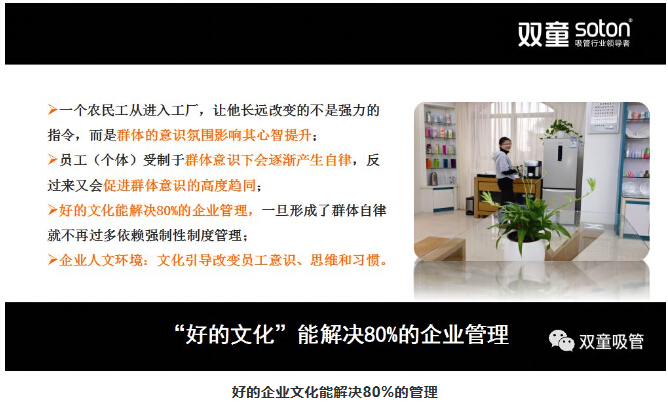 作為一個企業(yè)來說,企業(yè)的內(nèi)核是企業(yè)文化和組織思維。企業(yè)文化分為顯性文化和隱性文化。“雙童”的花園式工廠、綠化環(huán)境、文化標(biāo)語等都是表面的顯性文化。