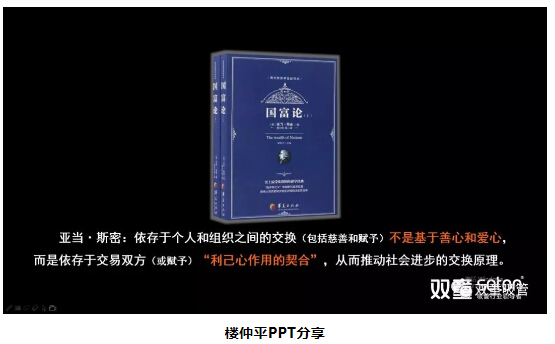當(dāng)晚,樓仲平將二十年前閱讀,并一直影響他至今的書籍《國(guó)富論》(此書被譽(yù)為“西方經(jīng)濟(jì)學(xué)圣經(jīng)”)也帶到了現(xiàn)場(chǎng),并直白地告訴大家,正是因?yàn)橐詠啴?dāng)斯密的《國(guó)富論》為代表的西方哲學(xué)思想影響,他才能夠理解商業(yè)的底層邏輯,才能夠從另一個(gè)維度來認(rèn)知:“雙童”的所作所為,并不是基于善心和愛心,而是基于商業(yè)交換原則下“利己心作用的契合”!