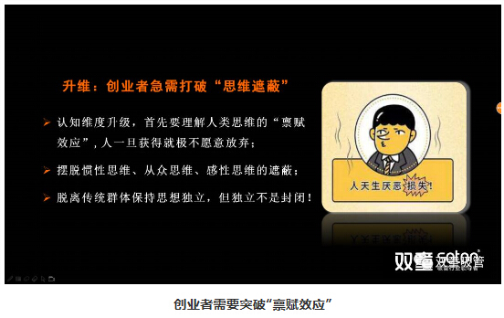 接著,樓仲平通過“稟賦效應(yīng)”的案例講述,讓大家理解到人一旦獲得就不愿意放棄,思想一旦陷入舊的傳統(tǒng)范式中,就極難轉(zhuǎn)換到新的思維范式中去。因此,創(chuàng)業(yè)者需要打破慣性思維、從眾思維、感性思維的“思維遮蔽”,突破“稟賦效應(yīng)”,脫離傳統(tǒng)群體保持思想獨(dú)立,從而實(shí)現(xiàn)認(rèn)知升維!