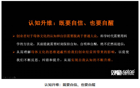 又例如,我們的母體文化隸屬于東亞局域文化,它發(fā)源于中原,是封閉地貌環(huán)境下形成的封閉文化,缺乏開放性的海洋文化、商業(yè)文化和自然科學(xué),古人認(rèn)知自然均用迷信和臆造。雖然母體文化能給我們帶來結(jié)構(gòu)性的支持,也給我們帶來一條狹窄通道下的“自我封閉”。所以,作為中國(guó)創(chuàng)業(yè)者,我們要理解和反思在母體文化的局限下給我們思維上帶來的遮蔽和影響,要警惕“自我封閉”,從而看不到宏大世界的真相,陷入到眼見為“真”的假象當(dāng)中。