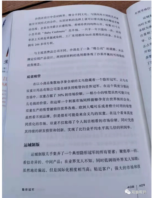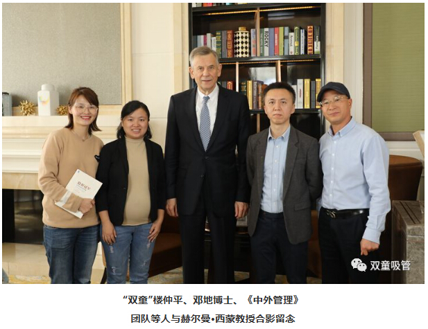 中國(guó)企業(yè)千千萬(wàn),說(shuō)到“隱形冠軍”也有不少,可為何此次《中外管理》雜志特別邀請(qǐng)了樓仲平一同前往采訪西蒙教授呢?原來(lái),早在2018年的首屆“中國(guó)造·隱形冠軍”評(píng)選活動(dòng)中,“雙童”就經(jīng)過(guò)陳春花教授等七位評(píng)委專家的評(píng)選,從24家優(yōu)秀企業(yè)中脫穎而出,被推選為首批“中國(guó)造·隱形冠軍”。除此之外,在西蒙教授最新所著的《隱形冠軍》一書中,“雙童”也作為隱形冠軍企業(yè)案例被收錄其中!所以,此次的采訪“隱形冠軍之父”西蒙教授之行,“雙童”樓仲平作為中國(guó)隱形冠軍企業(yè)代表參與其中,也是再合適不過(guò)了!